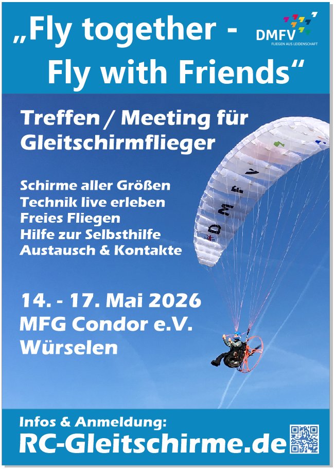 Vom 14. bis 17. Mai 2026 (Christi Himmelfahrt bis Sonntag) treffen sich Modellflug-Begeisterte auf dem Fluggelände der MFG Condor e.V. in Würselen bei Aachen. Egal ob Einsteiger oder Acro-Profi – im Mittelpunkt stehen gemeinsames Fliegen, Fachsimpeln und gegenseitige Hilfe rund ums Modell. Freut euch auf entspannte Tage am Flugplatz und gemütliche Abende mit Gleichgesinnten.